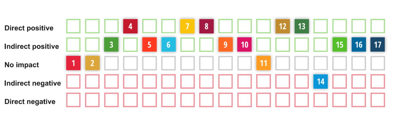 The overview below shows our SDG analysis for the year 2025. We carried out this analysis using the UN's Impact Assessment Tool. Here, we analysed the impact our business activities have on each of the 17 goals. The impact is either direct or indirect, positive or negative. If we have no impact, the assessment is ‘No impact’.